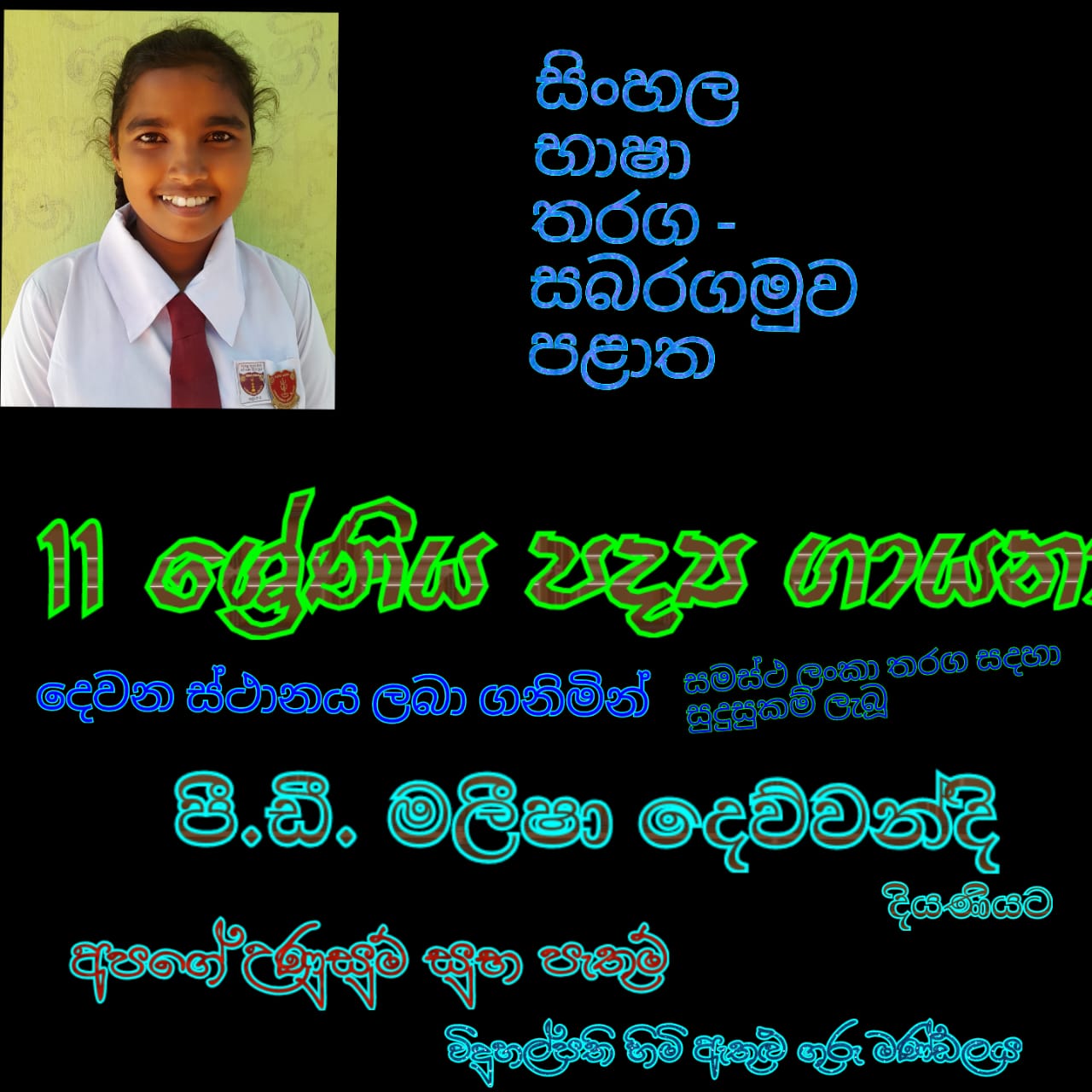 11 ශ්රේණිය පද්ය ගායනා තරගයෙන් දෙවන ස්ථාන ජයක් ලබා ගැනීමට අප පාසලට හැකි විය. පී.ඩී. මලීසෘ දෙව්වන්දි ශිෂ්යයාව තම දක්ෂතා පෙන්වමින් මෙම ජයග්රහණය ලබා ගැනීමට සමත් වීය. ඇය වසර ගණනාවක් ම පළාත් තරග සඳහා සුදුසුකම් ලැබූ දක්ෂ ගායිකාවකි. මෙවර ඇයට සමස්ථ ලංකා තරග සඳහා ඉදිරිපත්වීමට අවස්ථාව උදාවුණි. ඒ සඳහා ඇප කැප වී කටයුුුතු කළ සියලු දෙනාටම ස්තුතිවන්ත වන අතර මලීෂා දියණියට සමස්ථ ලංකා ජයග්රහණය ලබා ගැනීමට හැකි වේවායි ප්රාර්ථනා කරමු.